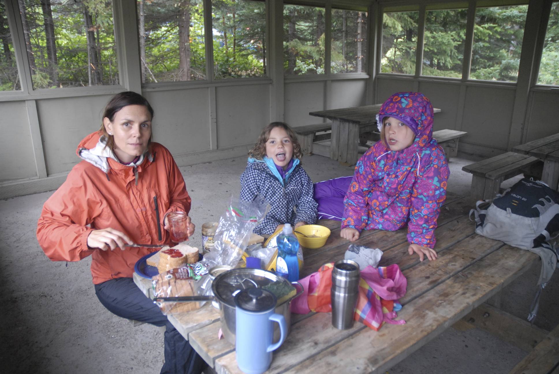 Still, we herded inside and found a small circle of benches around a wood stove, shed our exterior layers, and Val refueled the girls with two sandwiches each, on cheese, one peanut butter and jelly.