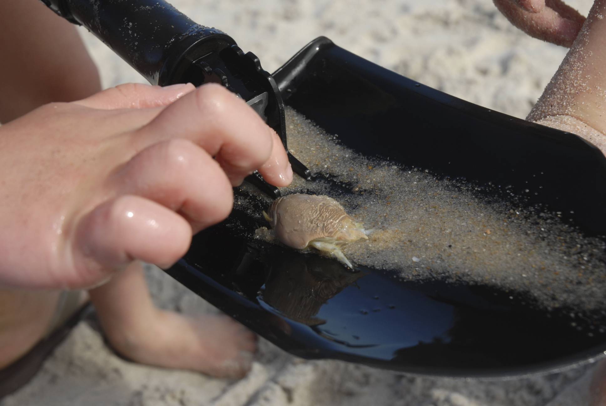 We all swam, drifting down along the shore with a mild rip, then ordering the girls to climb out just prior to the fishermen’s poles only to run up the beach and do it all over again. We jumped off a smallish drop of sand into the water (the Cliffs of Doom) and inspected a bed of hundreds of fingernail-sized clams revealed by the surf (the Clams of Doom).
