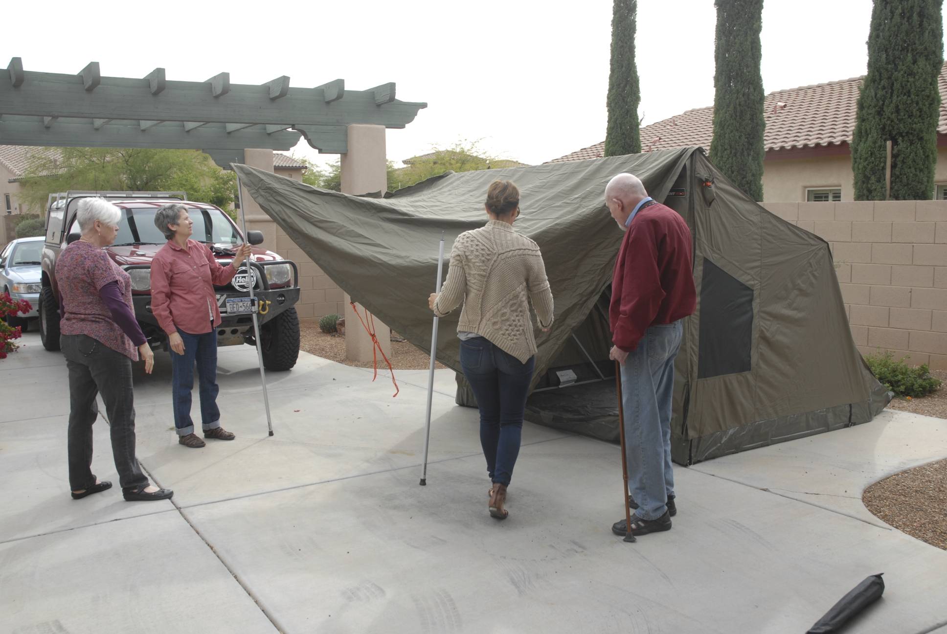 Val, her Mom, The C-Clamp and my Mom participate in the OZ Tent’s inaugural driveway set-up. It really did only take 30 seconds.