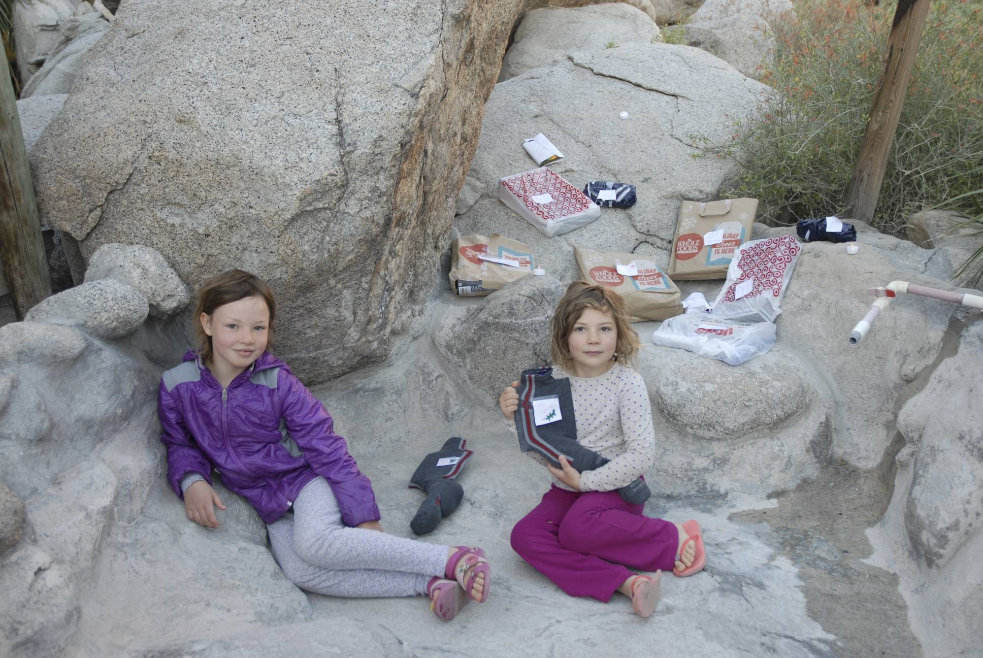 Sitting in front of Aqua Moose’s bounty… you can see the hiking socks the cagey old moose got from our tent to wrap the girls stuff.