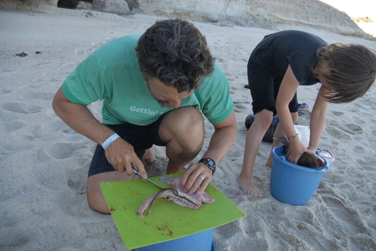 Dad cuts a fillet away, Leonie rinses the bass