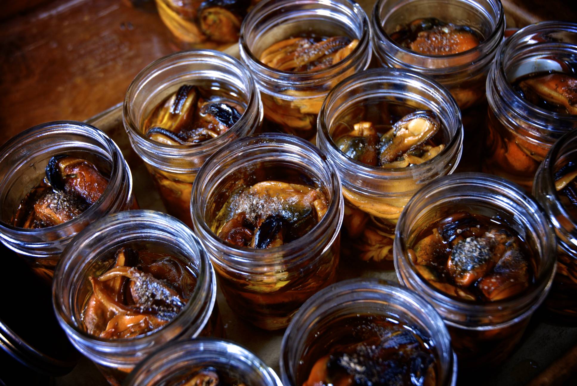 I lay the applewood on the hot madrone coals and smoked the mussels in batches of a hundred for half an hour or so, and then we placed them in jars, and filled the jars with olive oil and topped them each a pinch of smoked sea salt.