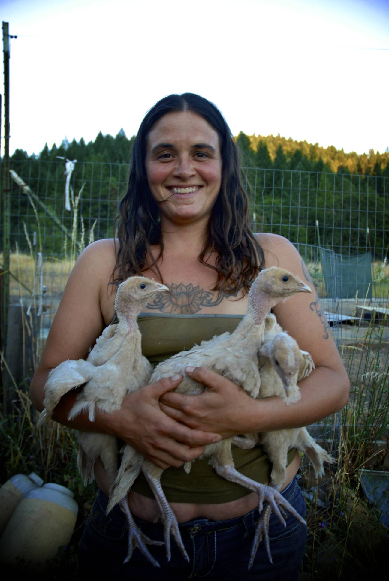 Leonie and I ran outside to find Sylvie climbing out of the outhouse window, dangling six feet above the ground, wide-eyed and caterwauling and completely surrounded by a gaggle of six turkey chicks on the ground below her, each staring up at her expectantly and peeping away.