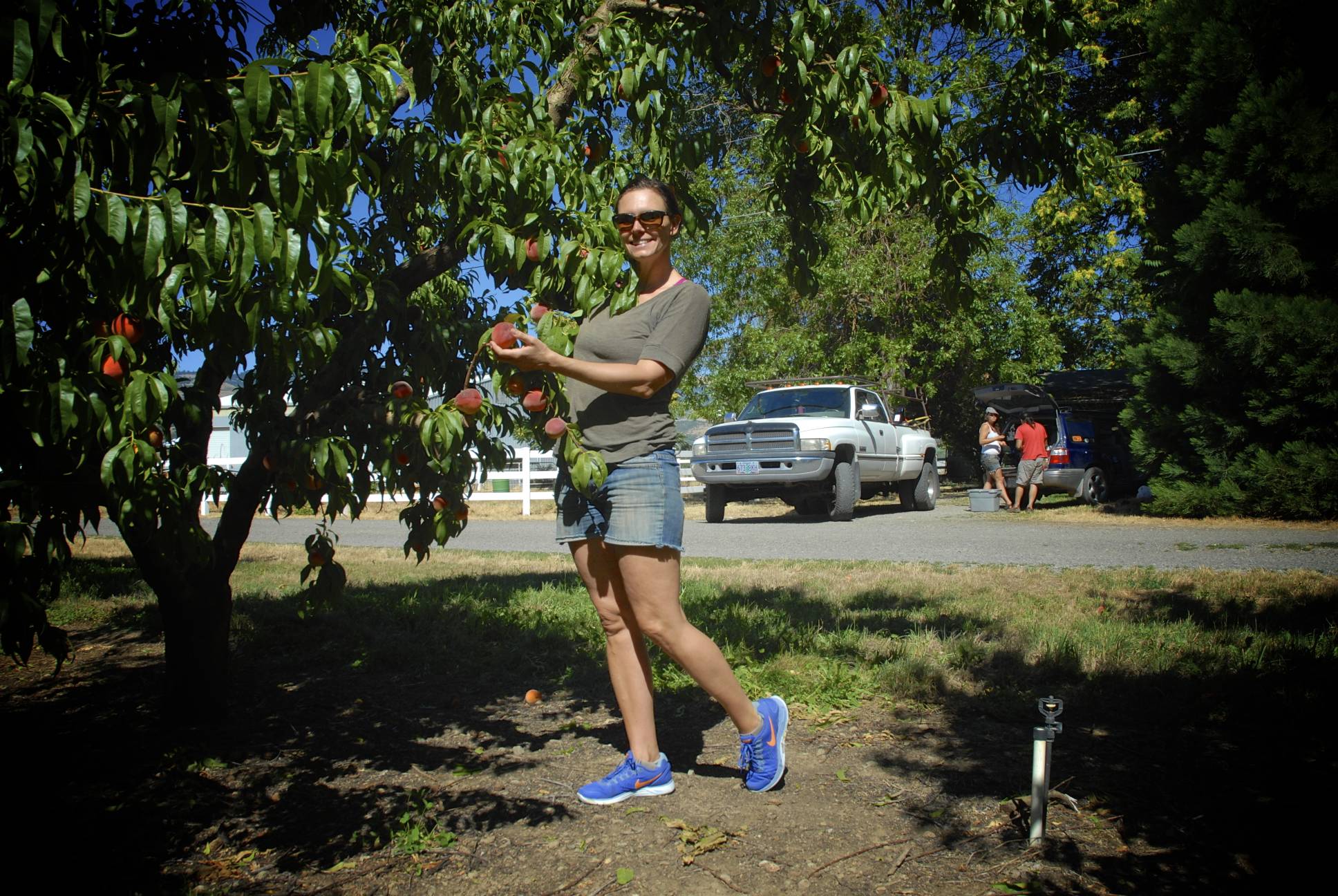 Here we see the lovely Valerie, contemplating the bounty that awaits us in the peach orchard, while Feral, Stephanie, and the big old Dodge lurk in the background.